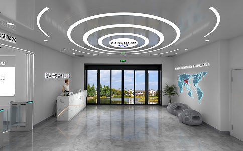 內部頂造型:軟膜天空吊頂+LED線性燈帶凸顯展廳高端大氣。LED高清液晶屏,人臉識別系統(tǒng)、展廳接待沙發(fā)+茶幾。